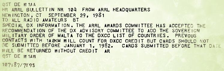 With this telegram, ARRL added the Sovereign Military Order of Malta as a DXCC Award eligible entity. Starting January 1st, 1982 the cards of QSOs with 1A began to be checked and approved to the great pleasure of all who would pursue DXCC. Now, some 30 years later thist the prefix is still quite needed by DXers from the amateur Radio community.