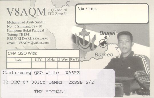 I got this card from Michal, WA6RZ, who lives in El Dorado Hills. He worked Mohammad, V8AQM, in 2007, on 20 meter SSB.
